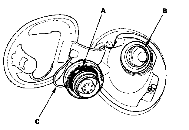 2. Check the fuel fill cap seal (A) and the fuel fill pipe mating surface (B). Verify that the fuel fill cap tether cord (C) is not caught under the cap.
