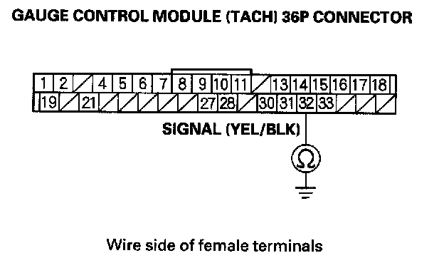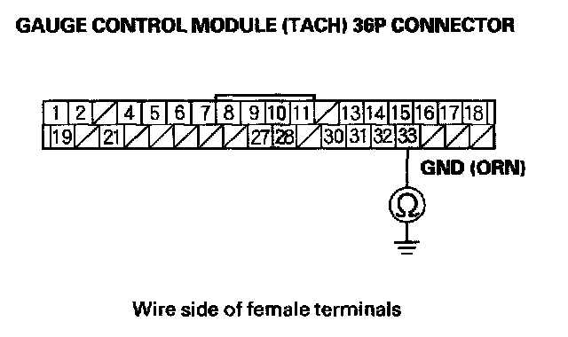 11. Check for continuity between gauge control module (tach) 36P connector terminal No. 33 and body ground.