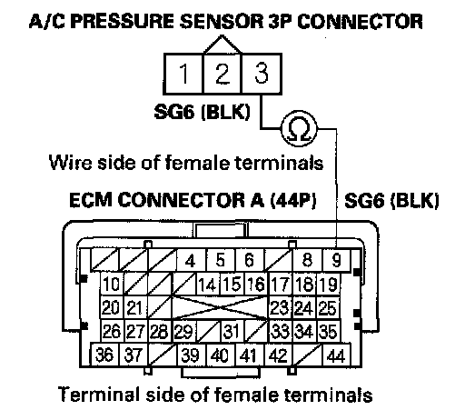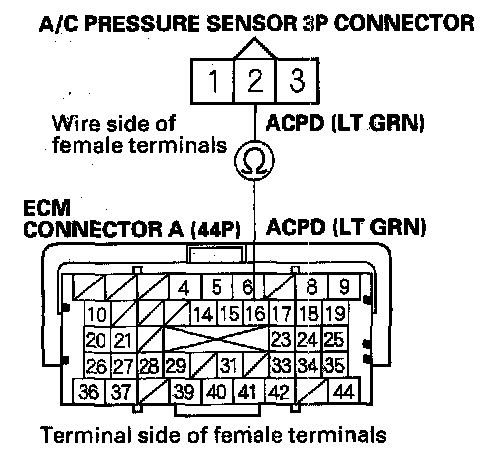 17. Check for continuity between A/C pressure sensor 3P connector terminal No. 2 and ECM connector terminal A16.