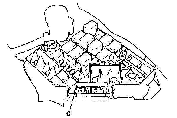 11. Remove PGM-FI main relay 1 (C) from the under-hood fuse/relay box.