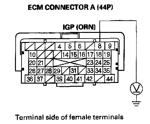 14. Measure voltage between ECM connector terminal A8 and body ground.