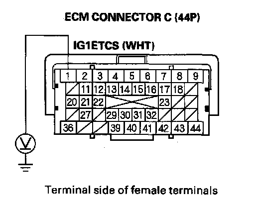 11. Measure voltage between ECM connector terminal C1 and body ground.
