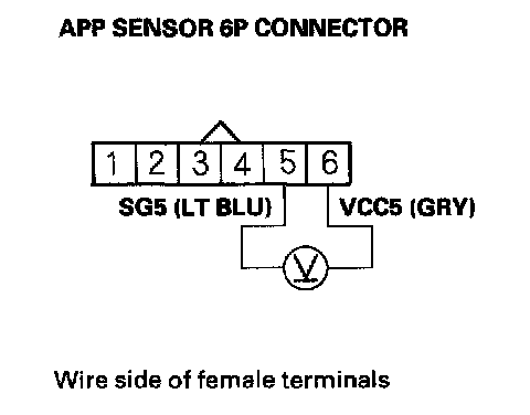 6. Measure voltage between APP sensor 6P connector terminals No. 5 and No. 6.