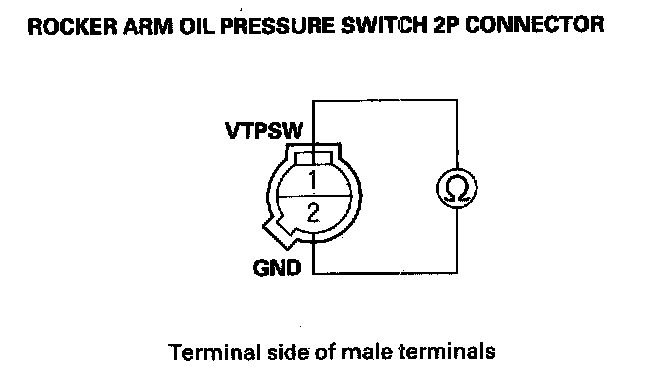 8. At the rocker arm oil pressure switch side, check for continuity between rocker arm oil pressure switch 2P connector terminals No. 1 and No. 2.