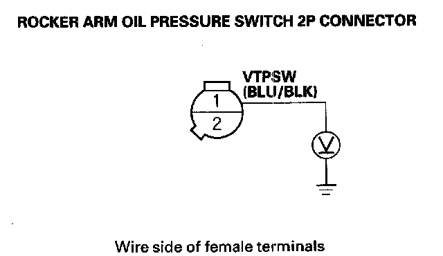 10. Measure voltage between rocker arm oil pressure switch 2P connector terminal No. 1 and body ground.