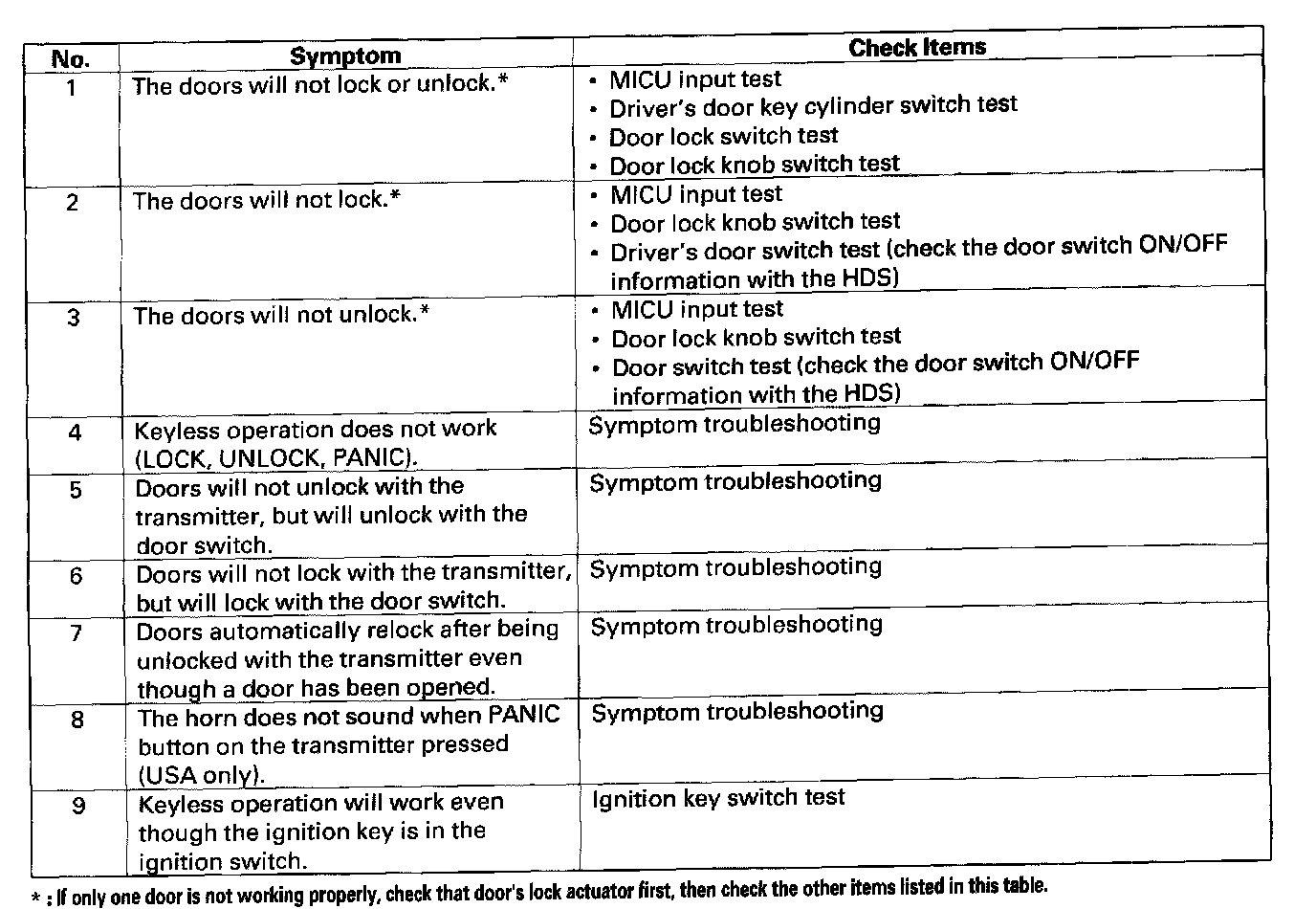 1. If the door lock system works properly, but the keyless operation does not, refer to the immobilizer-keyless control unit symptom troubleshooting information. Symptom Troubleshooting Information