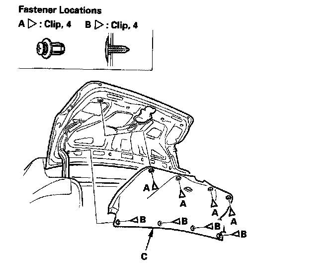 2. Remove the clips (A, B), then remove the trunk lid trim (C).
