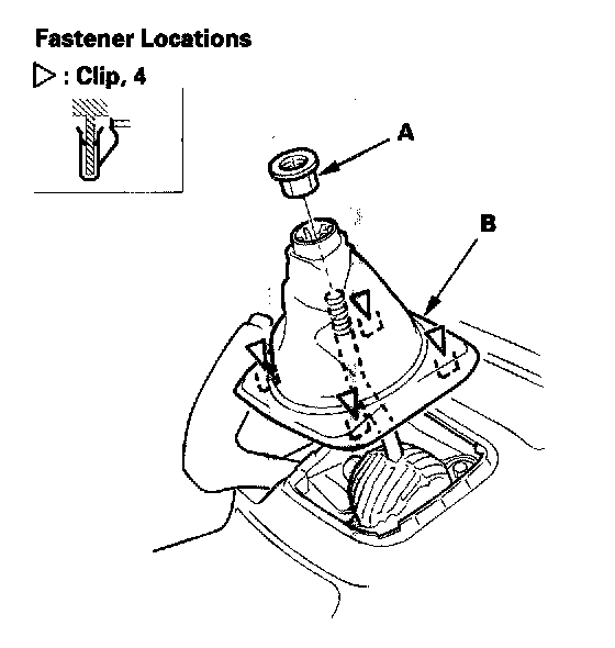 2. Loosen the locknut (A), then remove the shift knob (B).