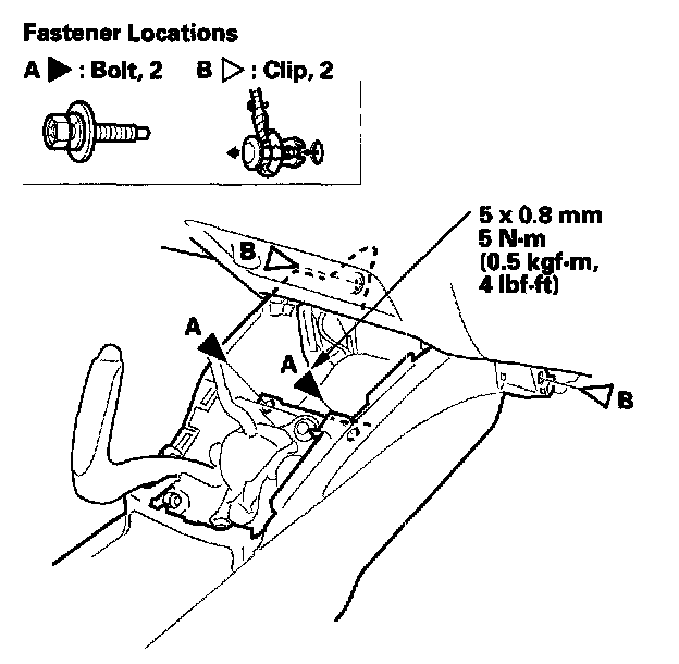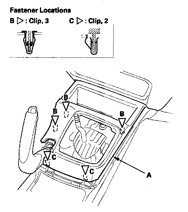 7. From the front portion of the center console, remove the bolts (A) and clips (B).