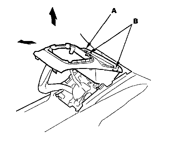 5. Pull the center console panel (A) up and rearward to release the tabs (B).