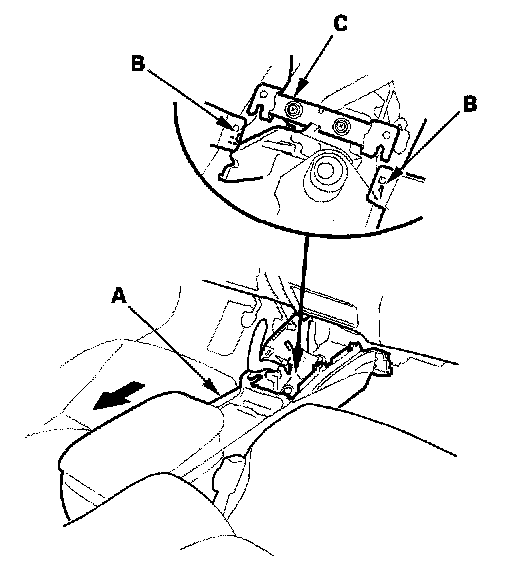 10. Slide the center console (A) rearward to release the pins (B) from the bracket (C).