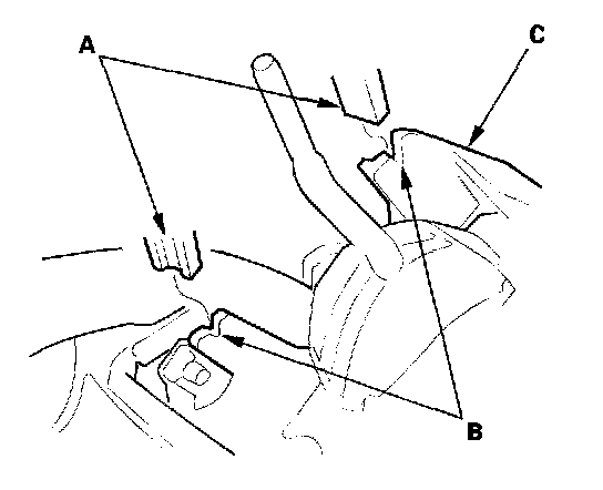 - When installing the center console panel, install the tabs (A) into the notch (B) of the parking brake base frame (C).