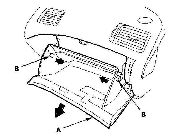 1. While holding the glove box (A), release the glove box stop (B) on each side from the dashboard by pushing them inside.