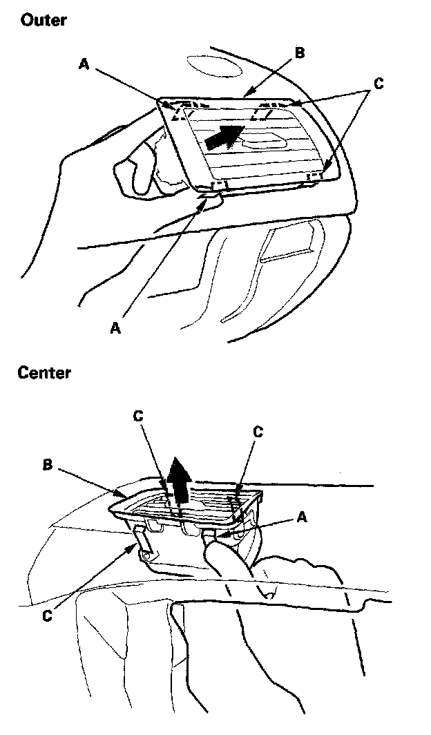2. Push on the side hooks (A) by hand to release them. Gently pull out the side vent (B) to release the other hooks (C), then remove the passenger's vent.