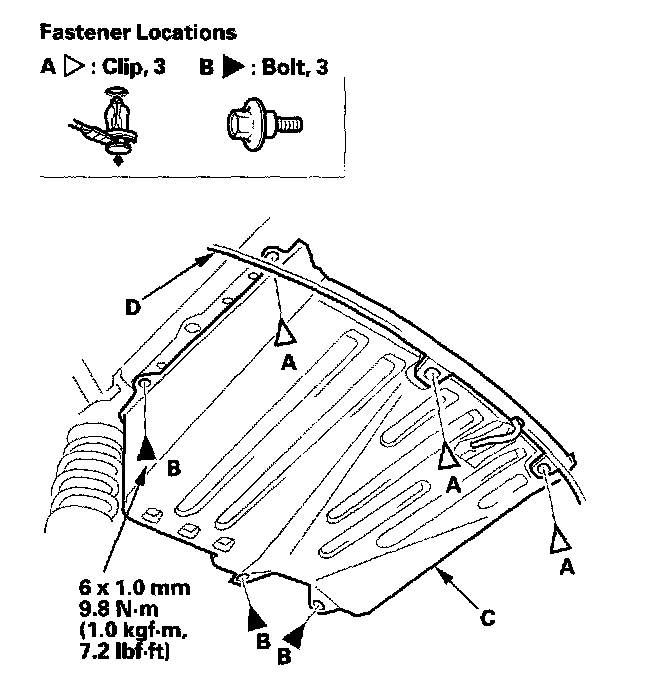 1. Remove the clips (A) and bolts (B), then remove the rear floor under cover (C). Take care not to scratch the rear bumper (D).