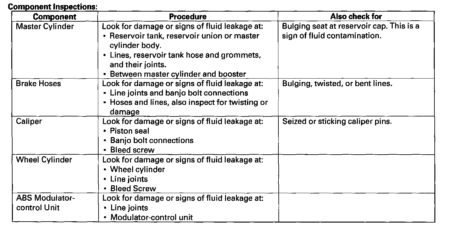 Brake System Inspection and TestInspect the brake system components listed. Repair or replace any parts that are leaking or damaged.