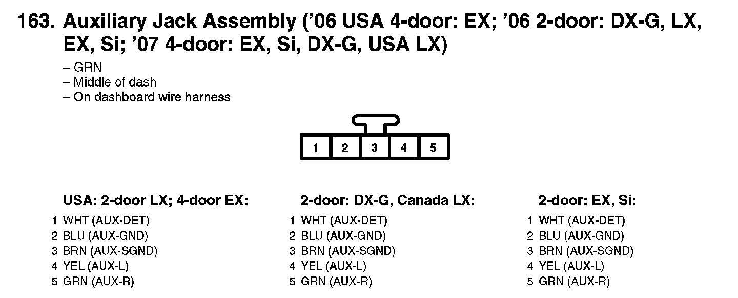 163. Auxiliary Jack Assembly ('06 USA 4-door: EX; '06 2-door: DX-G, LX, EX, Si; '07 4-door: EX, Si, DX-G, USA LX):