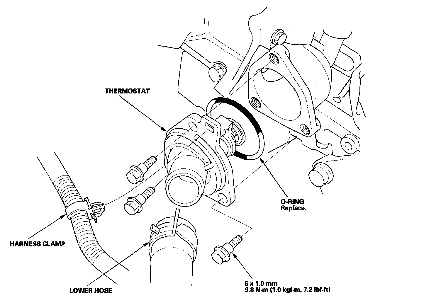 4. Install the thermostat with a new O-ring, then install the lower hose.