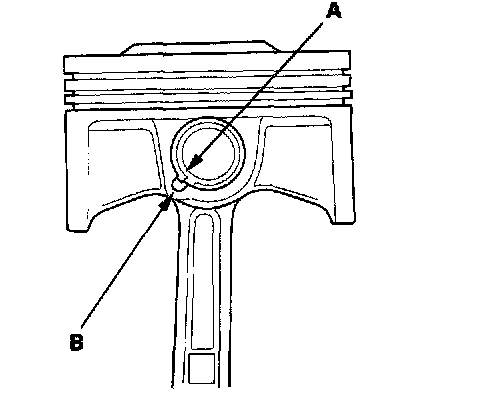 2. Apply new engine oil to the piston pin snap rings (A), and turn them in the ring grooves until the end gaps are lined up with the cutouts in the piston pin bores (B).