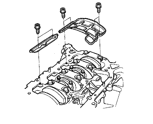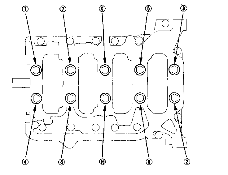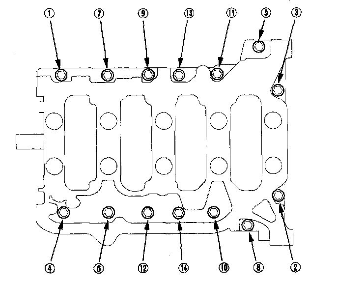 9. Remove the bearing cap bolts. To prevent warpage, unscrew the bolts in sequence 1/3 turn at a time; repeat the sequence until all bolts are loosened.