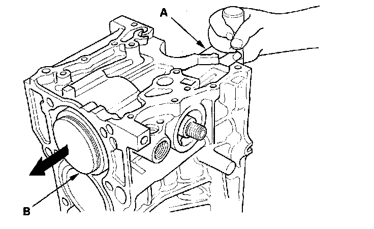 15. Use the wooden handle of a hammer (A) to drive out the piston/connecting rod assembly (B).