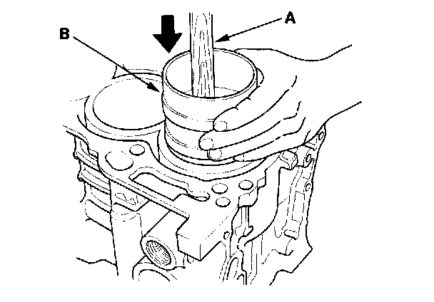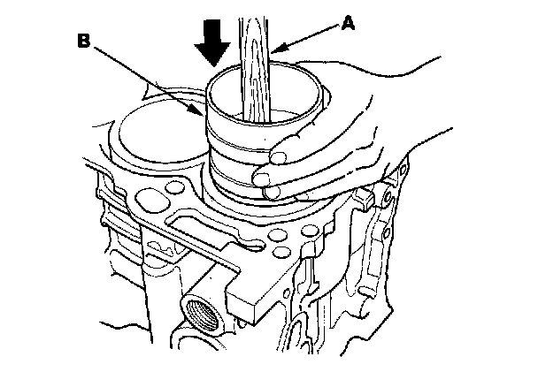 4. Position the piston in the cylinder, and tap it in using the wooden handle of a hammer (A). Push down on the ring compressor (B) to prevent the rings from expanding before entering the cylinder bore.