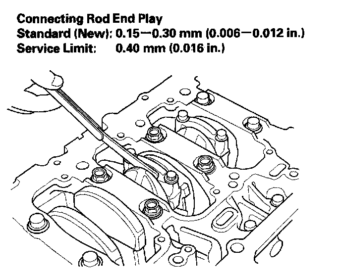 4. If the connecting rod end play is beyond service limit, install a new connecting rod, and recheck. If it is still beyond service limit; replace the crankshaft.