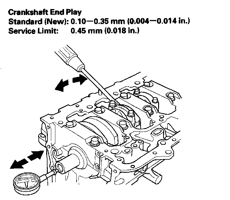 6. If the end play is beyond service limit, replace the thrust washers and recheck, if it is still beyond service limit, replace the crankshaft.