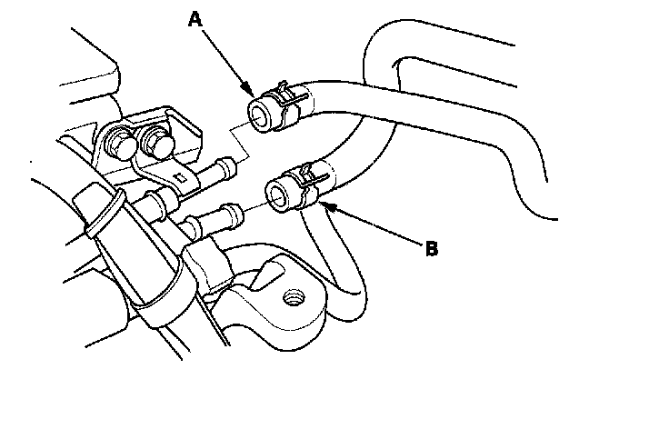7. Remove the evaporative emission (EVAP) canister hose (A) and brake booster vacuum hose (B).