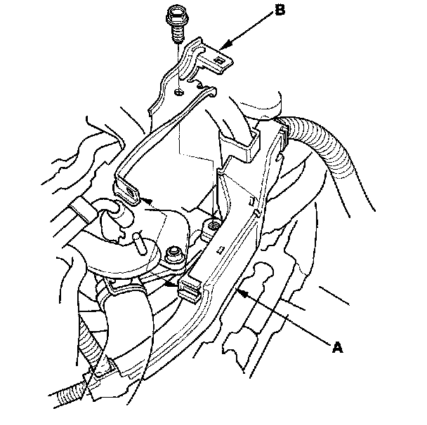 9. Remove the harness holder (A) from the bracket, then remove the harness holder bracket (B).