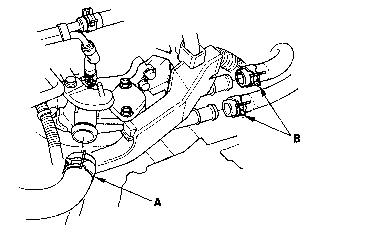 10. Remove the upper radiator hose (A) and heater hoses (B).