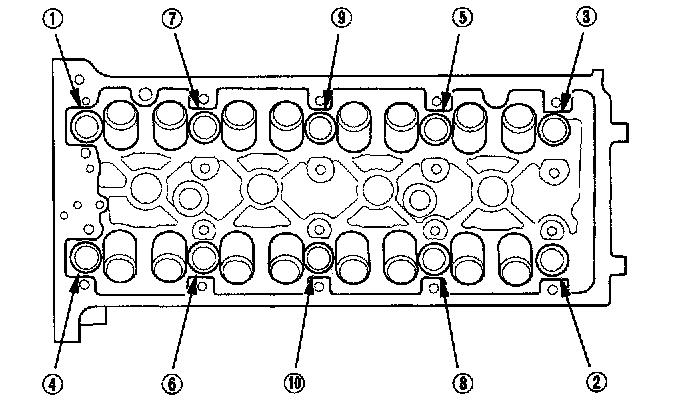15. Remove the cylinder head bolts. To prevent warpage, unscrew the bolts in sequence 1/3 turn at a time; repeat the sequence until all bolts are loosened.
