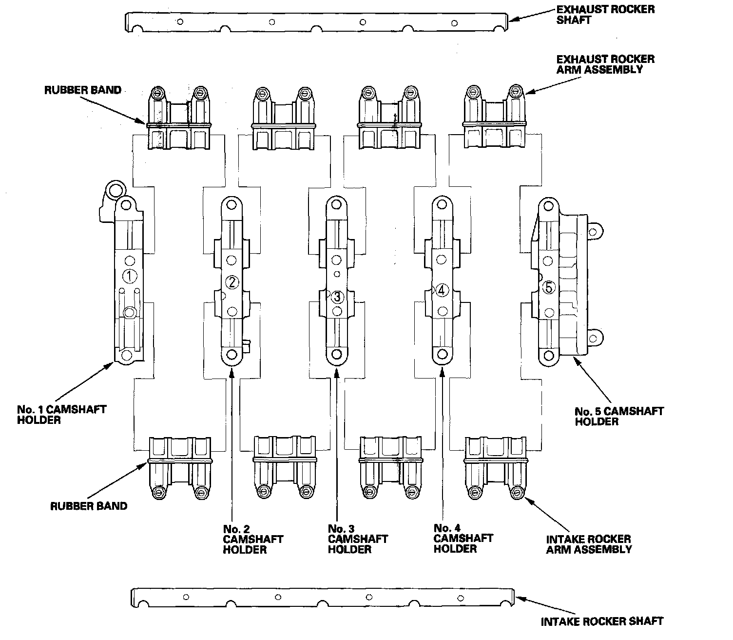 ^ When removing, or installing the rocker arm assembly, do not remove the camshaft holder bolts. The bolts will keep the holders and rocker arms on the shaft.