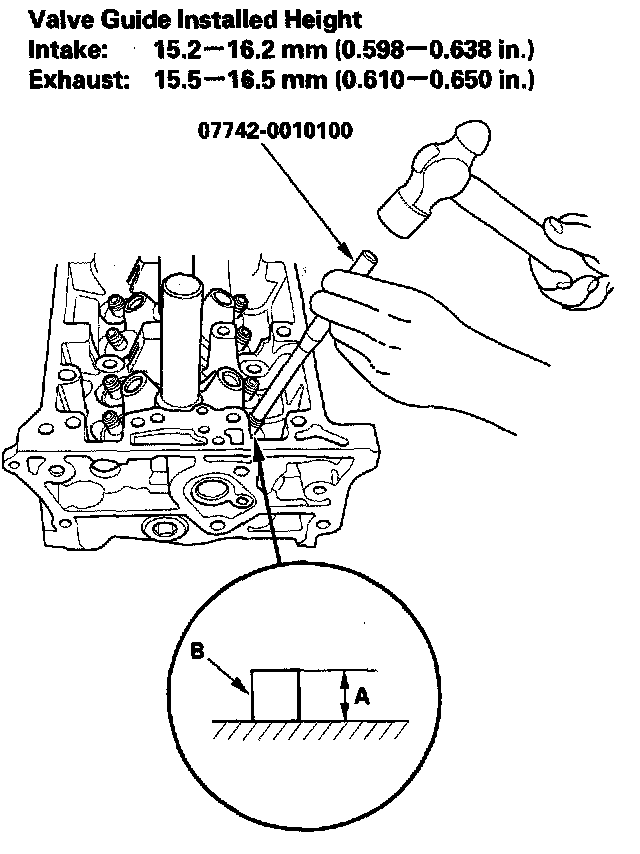 9. Apply a thin coat of clean engine oil to the outside of the new valve guide. Install the guide from the camshaft side of the head; use the special tool to drive the guide in to the specified installed height (A) of the guide (B). If you have all 16 guides to do, you may have to reheat the head.