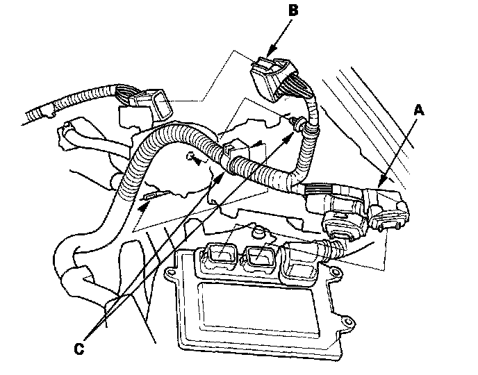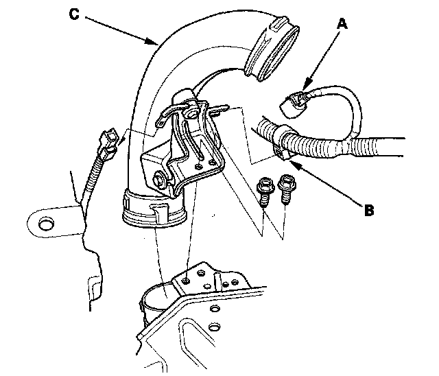 8. Disconnect the connector (A), and remove the harness clamp (B), then remove the resonator (C).