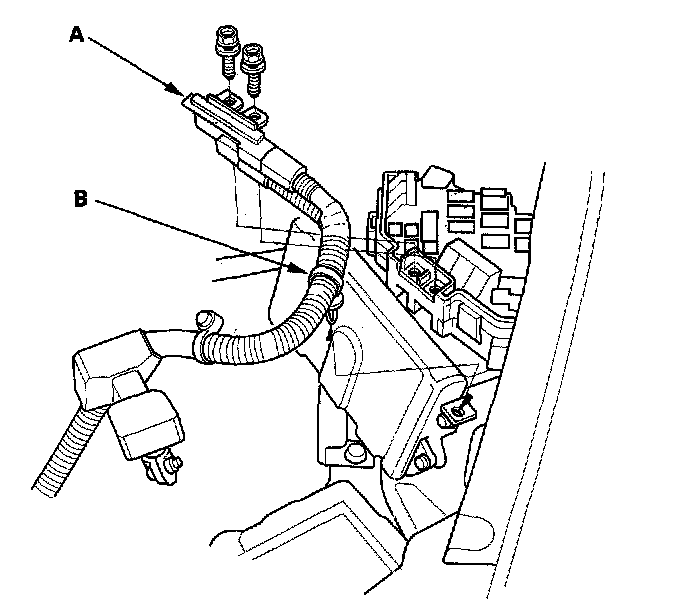 11. Remove the engine control module (ECM) cover (A), then remove the three bolts (B) securing the ECM.