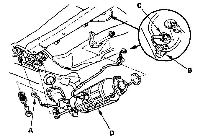 29. Remove the grommet (B), then disconnect the secondary heated oxygen sensor (secondary HO2S) connector (C).