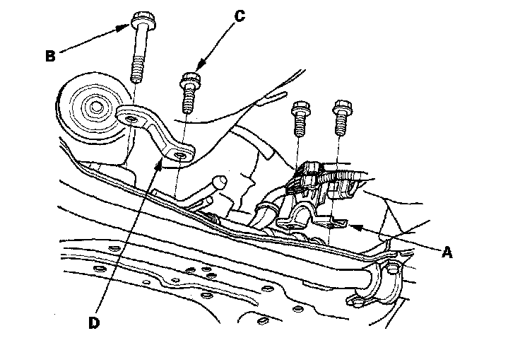 35. Remove the steering gearbox mounting bolt (B), stiffener mounting bolt (C), and stiffener (D).
