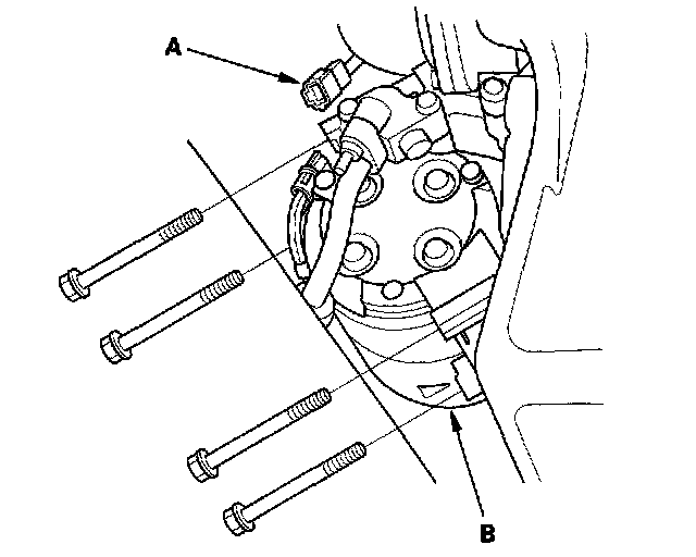 38. Disconnect the A/C compressor clutch connector (A), then remove the A/C compressor (B) without disconnecting the A/C hoses.