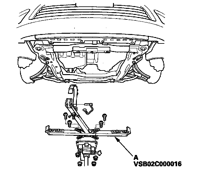 50. Attach the front subframe adapter (A) to the subframe and hang the belt of the subframe adapter over the front of the subframe, then secure the belt with its stop.