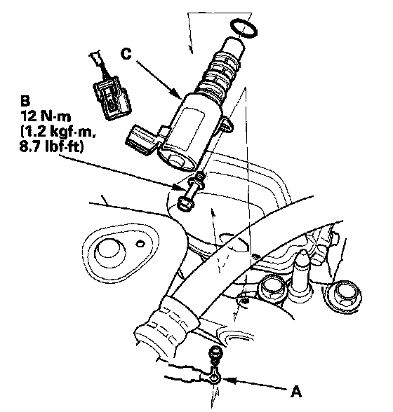 3. Remove the bolt (B) and the VTC oil control solenoid valve (C).