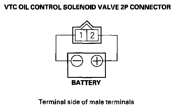 6. Connect the battery positive terminal to VTC oil control solenoid valve 2P connector terminal No. 2.