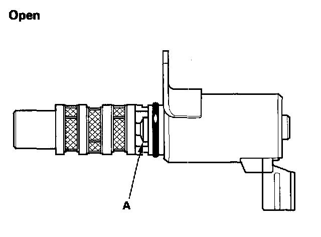 7. Connect the battery negative terminal to VTC oil control solenoid valve 2P connector terminal No. 1. Appearance of inner valve (A) in the port should be at least 1/16 in. (1.2 mm). If the inner valve does not open, replace it; then go to step 7.