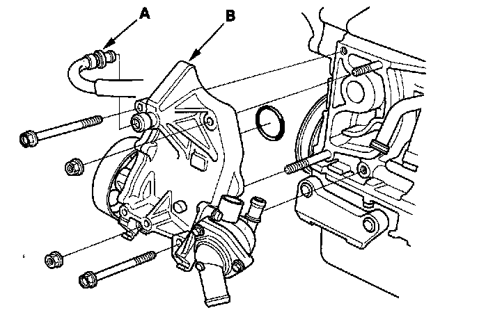 15. Install the water passage (A) with a new O-ring (B).