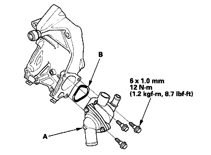12. Install the thermostat housing (A) with a new O-ring (B).