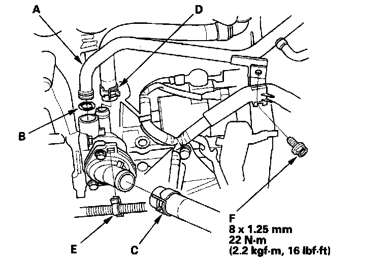 7. Remove the lower radiator hose (B), connecting pipe (C), water bypass hose (D), and harness clamp (E).