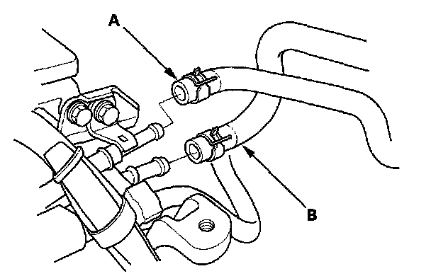 4. Remove the evaporative emission (EVAP) canister hose (A) and brake booster vacuum hose (B).