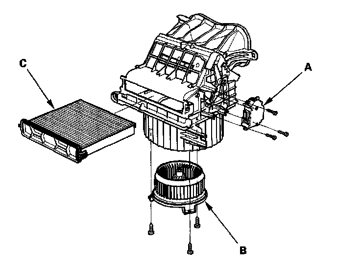 - The recirculation control motor (A), blower motor (B) and the dust and pollen filter (C) can be replaced without removing the blower unit.