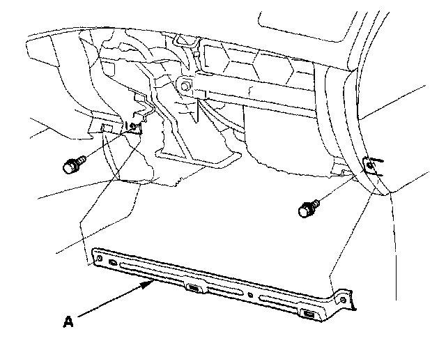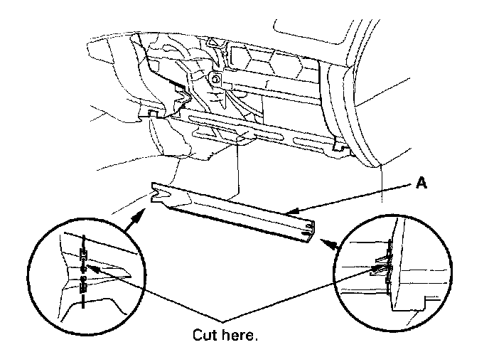 2. Cut the plastic cross brace (A) in the glove box opening with diagonal cutters in the area shown, and discard it.