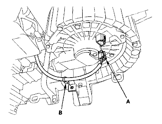 5. Disconnect the connector (A) from the blower motor. Remove the wire harness clip (B).